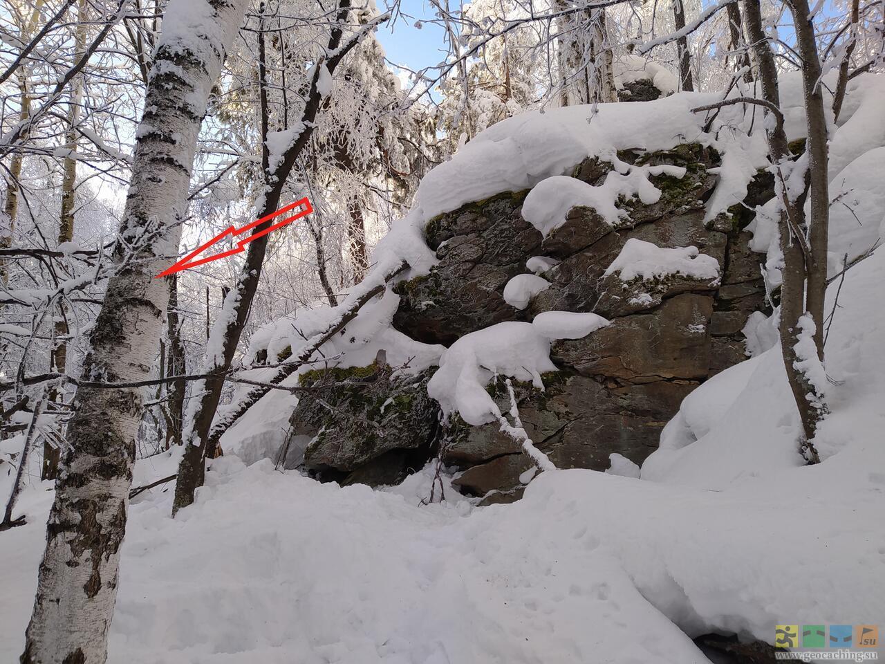 Примерно в 100 м от Калиничесва камня, на вырубке стоит несколько лиственниц. На третьей от камня, на высоте около 7 метров есть стрелка-указатель "Калиничев камень". Говорят, что она там находится как минимум 20 лет.