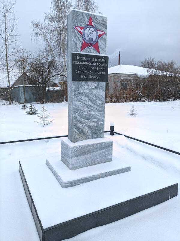 Памятник из мрамора, наверху – Орден гражданской войны, ниже – табличка «Погибшим в годы гражданской войны за установление советской власти в селе Щелкун».