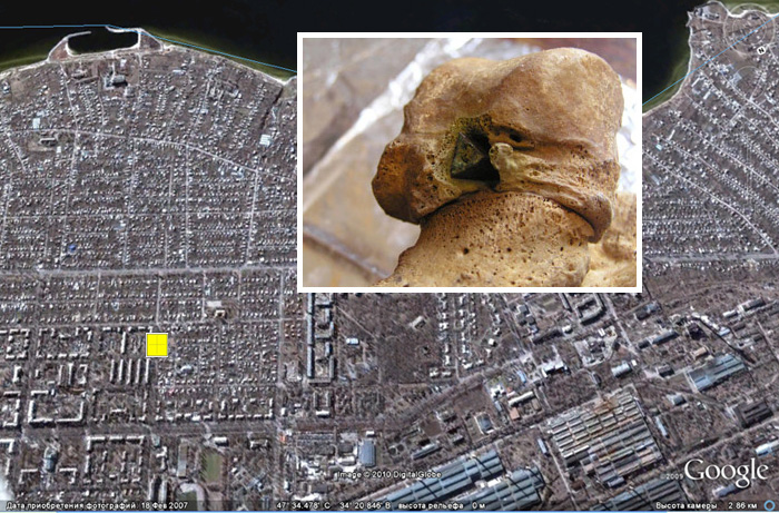 В Никополе (Днепропетровская область), в феврале 2007 года, обнаружено захоронение воина смертельно раненного в пятку стрелой (см.фото), ему было 40-45 лет, молодой женщины 18 лет и еще одного человека. На перекрестке улиц экскаватор выкапывал яму для оборудования будущей канализации и попал именно на это захоронение. Весь правый, «коренной», берег Днепра от центральной части Никополя (нынешний Парк Победы) аж до с. Алексеевки, то есть Чертомлыка, – это 14 км, известные в мировой научной литературе как «Никопольское курганное поле». Здесь были сотни, а то и тысячи могил от древнейших захоронений времен неолита – и до «бронзы» легендарные ариев и кочевников.
