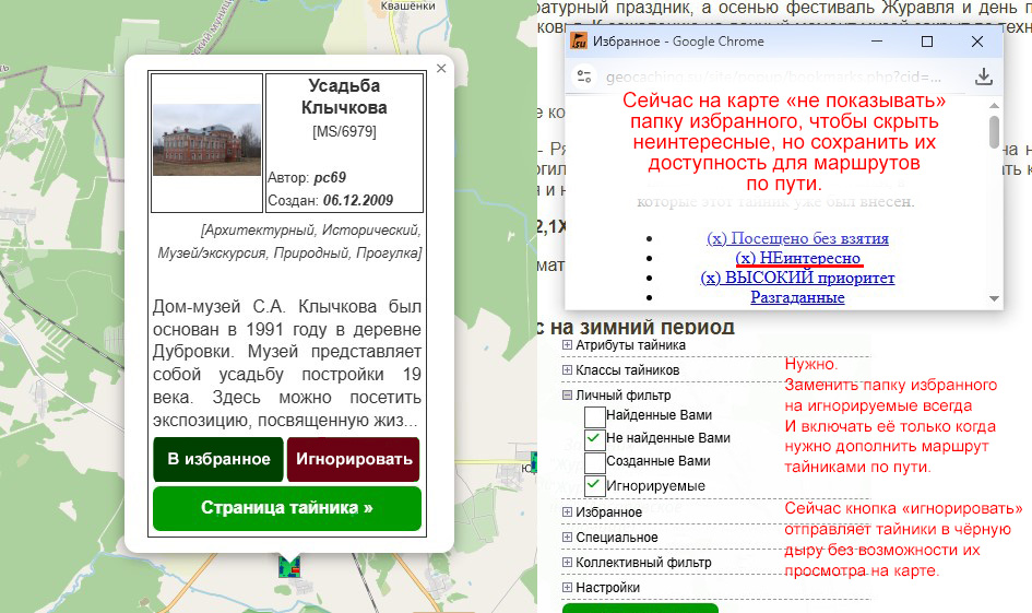 Смотрю, появились фильтры избранного для карты тайников. И не просто появились, а почти в точности как заказывал. ВАУ!!! Впервые мечты сбываются))). Огромное спасибо за услышанную просьбу и реализацию! Теперь игнорируемые тайники можно занести в отдельную папку и включать её по необходимости, не лазая в личный кабинет. Отдельное спасибо за галочку “Показывать только эту папку”. Я о ней не подумал, а она очень нужна, т.к. позволяет в походе быстро активировать и видеть перед глазами намеченный маршрут, а также быстро переключаться между маршрутами при планировании.