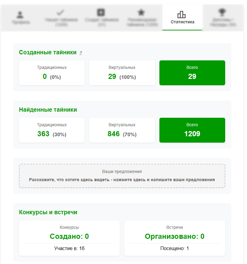 - На вкладку статистики профиля добавлен отдельный блок про тайники, созданные в соавторстве, а также разбивка по архивам\сомнительным для своих тайников