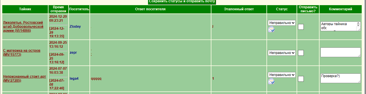 тайник, комментарий, время отправки (ширину этого столбца желательно подобрать такого размера, чтобы дата и время помещались в одну строку). - Цвет шрифта наименования тайника и посетителя требует замены (зелёный на зелёном ломает глаза!). Предположу, синий (вроде бы, так и было) гармонично впишется.