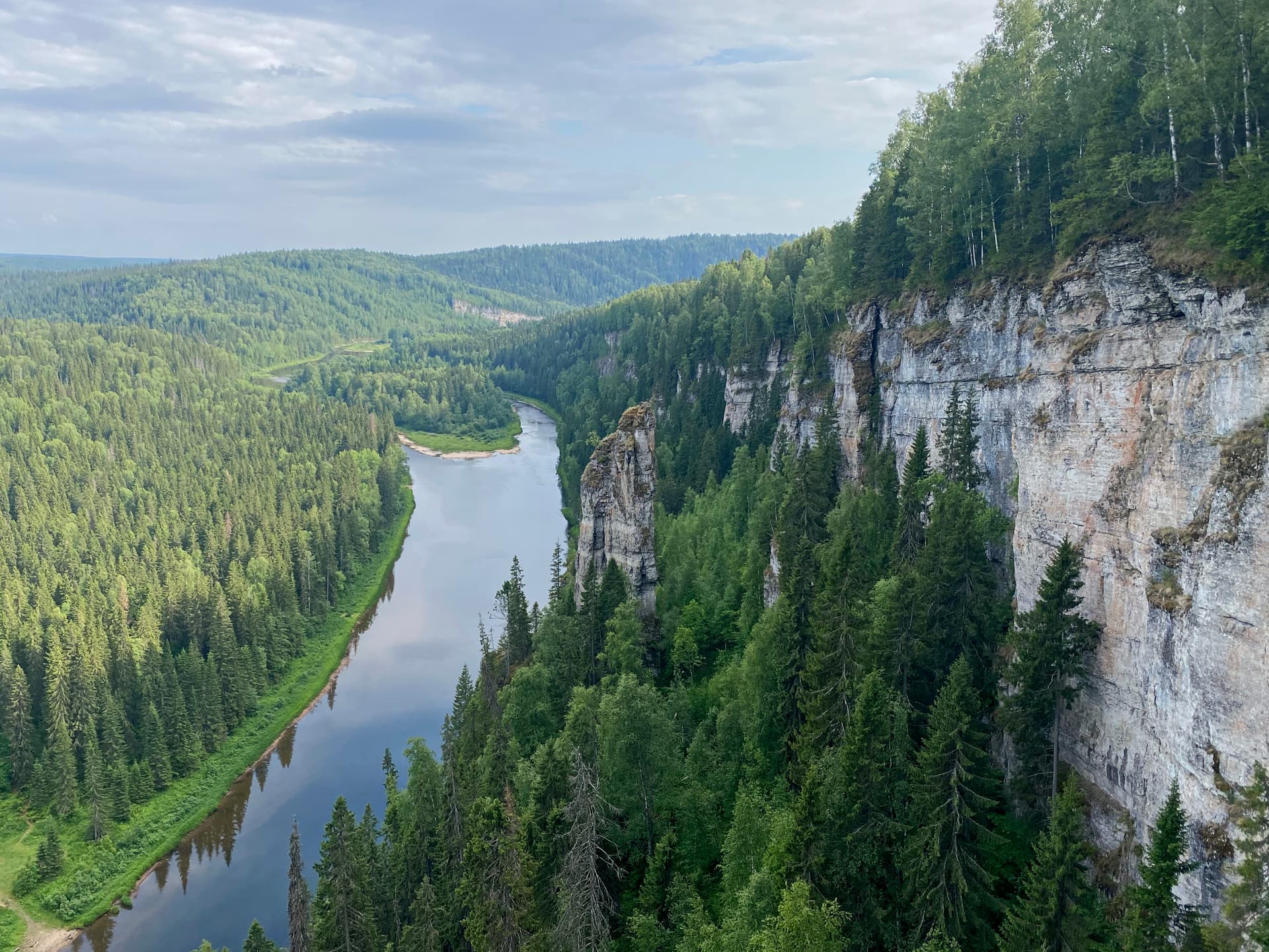 Обрыв. Ну прям отвесный. Тропа тож куда-то делась. Хотели вернуться и глянуть, где мы с неё сошли, но посмотрели назад и решили, что лучше нинада. Кое-кто, более ловкий и смелый, попытался спуститься вниз и чуть не агакнулся — берёза помогла. “Красивые, однозначно, красивые”, - подумали мы про себя. Успокоились. Потыркались вправо-влево. Вроде, что-то типа тропы слева увидели и ломанулись в ту сторону через всё подряд. Прошли по ней несколько метров по самому краю обрыва и всё - конец - она тож закончилась, уперлась в утёс и дальше можно было только вниз. Но зато отсюда было так хорошо видно рекууу и тропууу вдоль неё и казалось, что это всё очень близкооо, а там внизу люди гуляют… В шлёпках🤬Решили спускаться. Степень нашей красивости увеличилась. Сразу как-то куда-то слегка сползли по каким-то уступчикам. Уступчики кончились. Нашли деревья, за которые можно держаться, и ниже те, на которые можно встать. Ну ещё немного приблизились к цели. Дальше опять что-то типа маленького уступчика заметили. Один, держась за дерево, спустился и ловил второго, которому ничего не оставалось, кроме как свеситься на руках на этом же дереве. Кое-как вдвоём на маленьком уступчике устаканились. И вот тут у кое-кого возникло острое желание просто упасть дулом вниз. Но второй сохранял самообладание и нашёл дерево, растущее перпендикулярно скале и параллельно земле. Ему хватило роста, чтоб ещё немного спуститься, перебирая руками по стволу и веткам. Второй ел мало морковки в детстве (точно не зайка) и поэтому ему тупо пришлось съезжать, как раз дулом вперёд, хватаясь за кусты и траву (нормально, кстати, за шиповник цепляться, крепко держит, даже за одежду). Соответственно, первому пришлось опять ловить второго, чтоб он сильно далеко не уехал. Остановились, отдышались, нервно похихикивая. Посмотрели вниз. Большие деревья закончились, склон продолжал оставаться практически отвесным, чуть ниже кустарник (типа ивовый, шиповника видно не было) и высоченная трава. Но угол всё-таки стал побольше, чем 90 градусов, 110-115 где-то (ну это, если транспортир к земле приложить)…