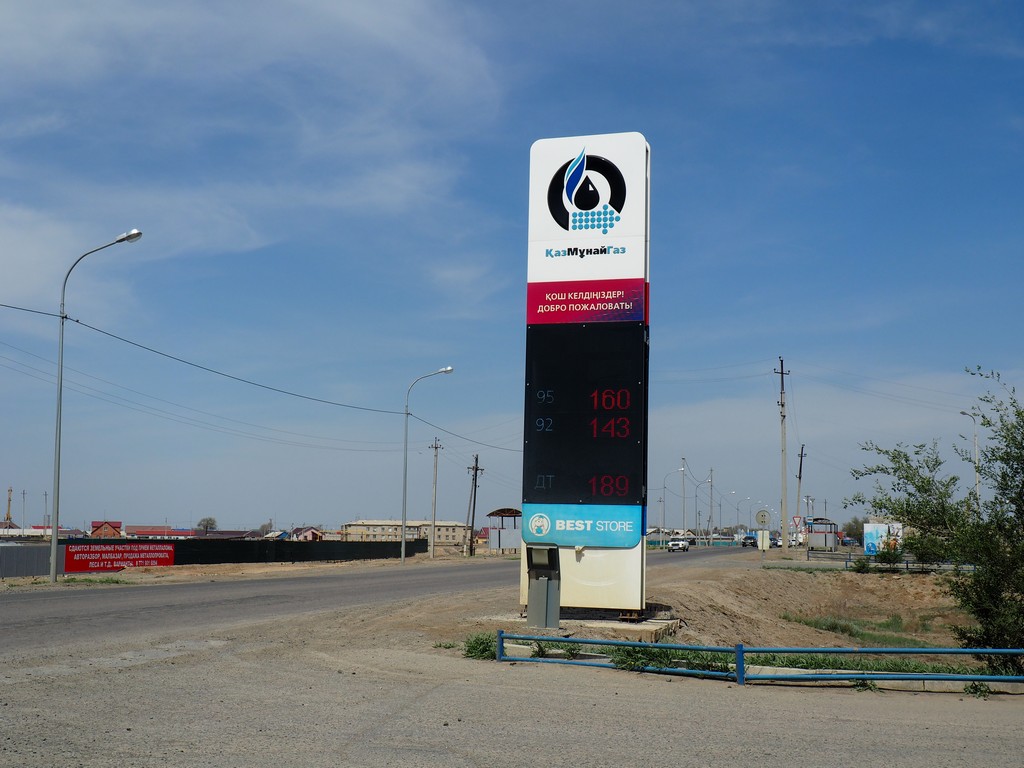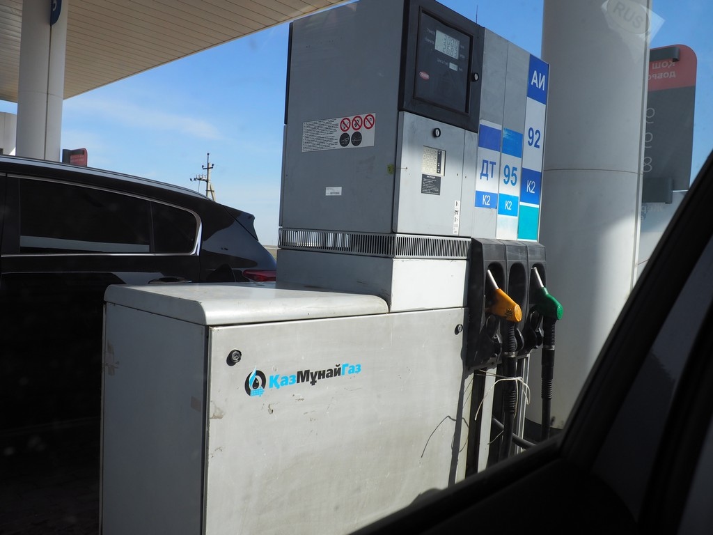 Заехали за бензином. Заправлялись только на заправках КазМунайГаз. Бензин 95 стоит 160 тенге, в переводе на рубли – 24 рубля за литр.